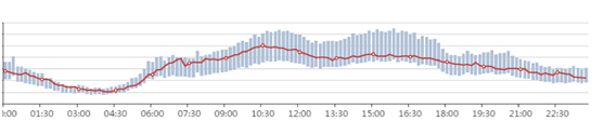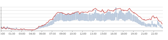注:途中灰色区域为平日正常时客流热度区间、红色曲线为9月30日客流热力值